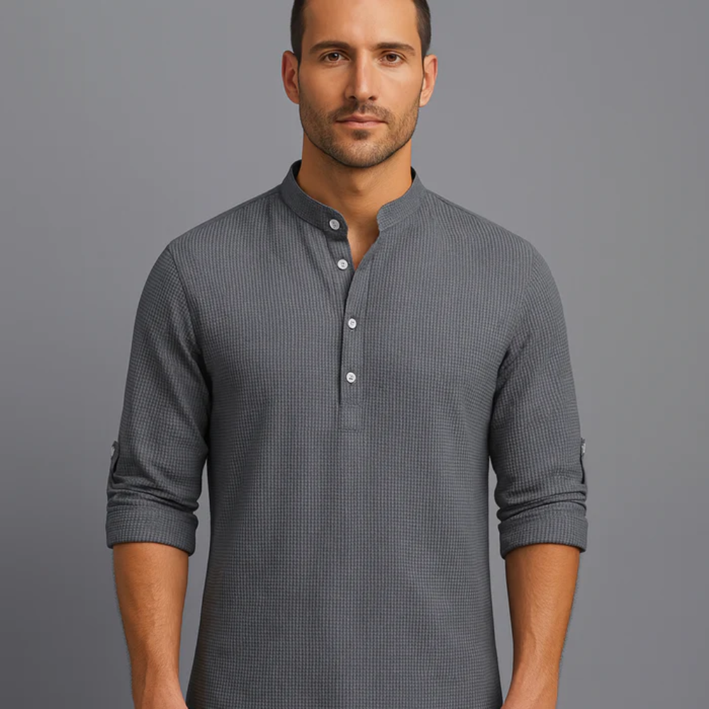 Der minimalistische Schnitt, inspiriert vom europäischen Lifestyle, wird durch eine moderne Stehkragenlösung mit teilweiser Knopfleiste ergänzt und verleiht dem Hemd eine zeitlose, zurückhaltende Ausstrahlung.
